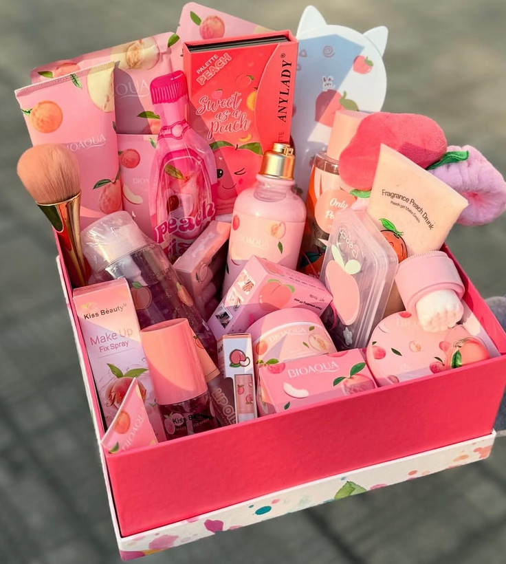 پالت آرایشی،بادی اسپلش،لوسیون بدن،نمک بدن،فوم صورت،کرم دست،میسلارواتر،پچ زیرچشم،اسکراپ،ژل ابرو،پک رژلب،براش،پرایمر،فیس واش،هدبند،فرمژه،برق لب،برس مو،۲ ماسک ورقه ای،باکس و پوشال