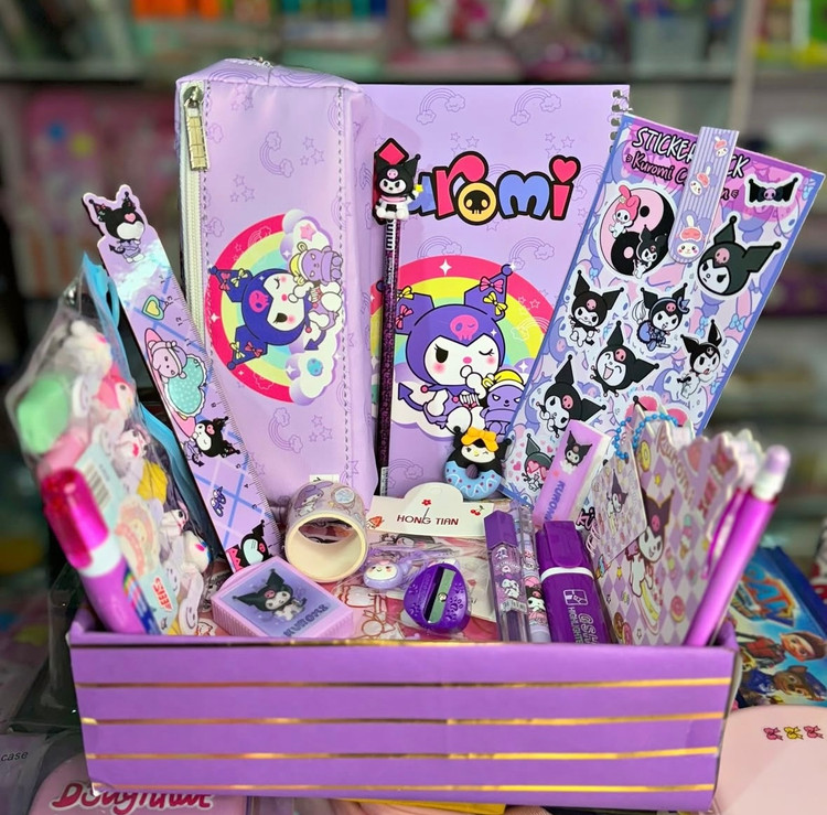 محصولات پک شامل2عدددفتر،جامدادی،خودکار چند رنگ،مداد،اتود،غلط گیر،پاکن،تراش،دفتریادداشت،مدادرنگی،هایلایتر،برچسب،گیره مو،باکس و پوشال