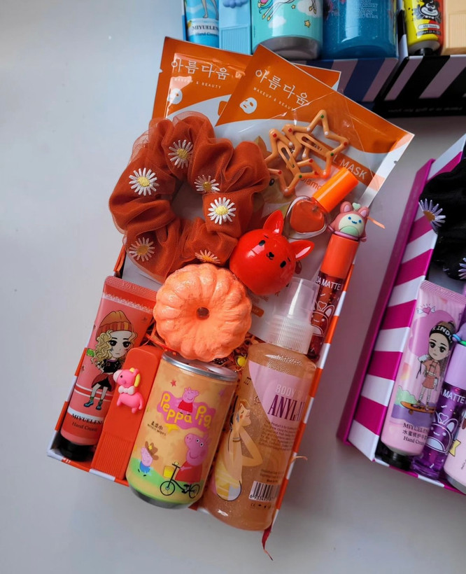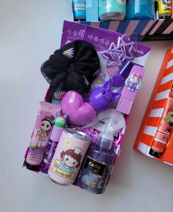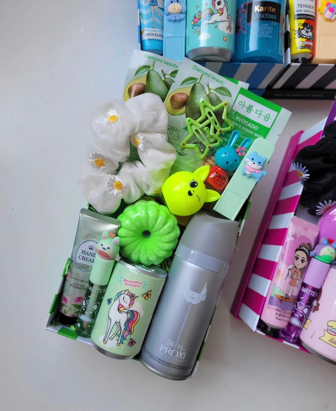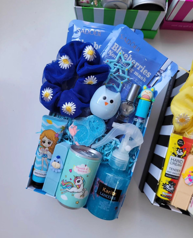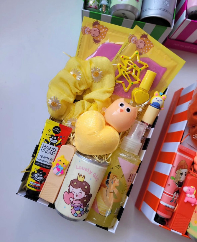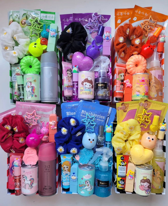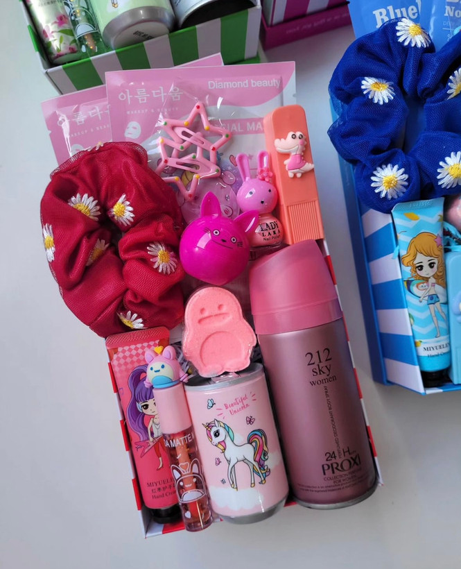 محصولات پک شامل: ماسک ورقه ای،گیره و کش مو،بالم لب،لاک،تینت لب،برق لب،مرطوب کننده،،دستمال مرطوب،عطرمو یا اسپری،باکس و پوشال