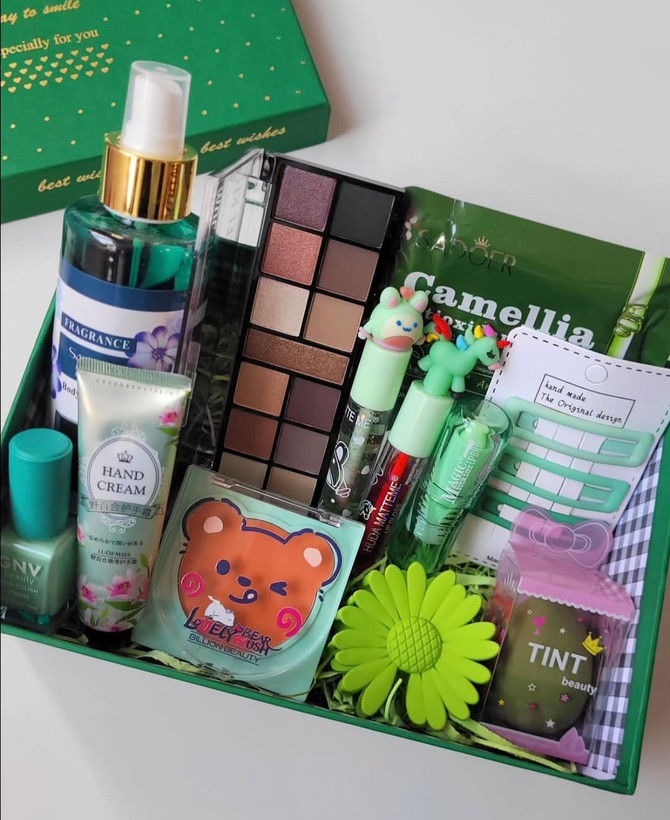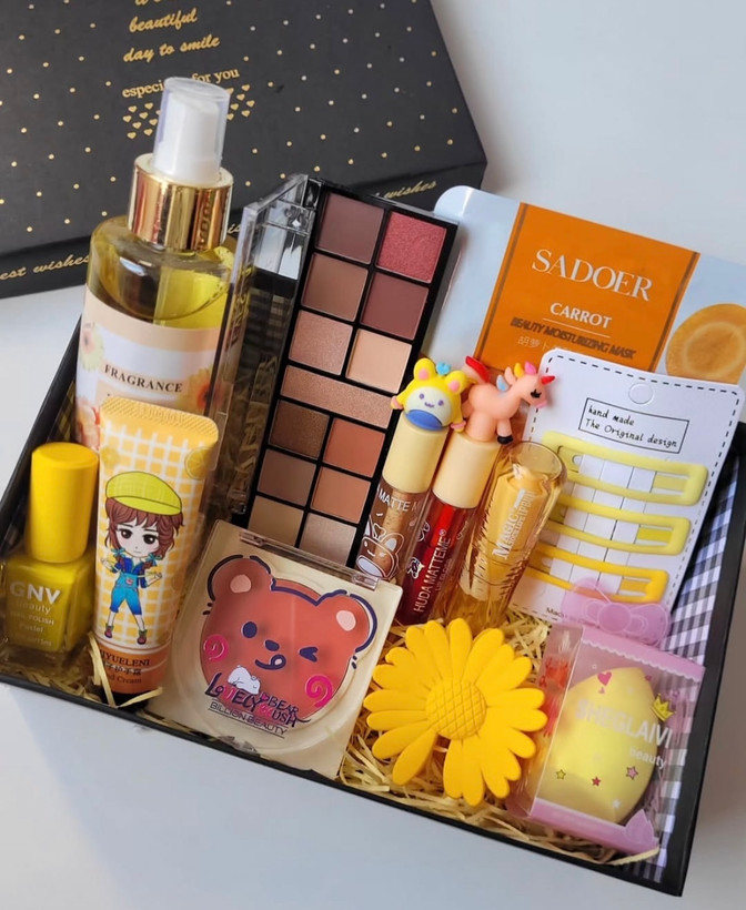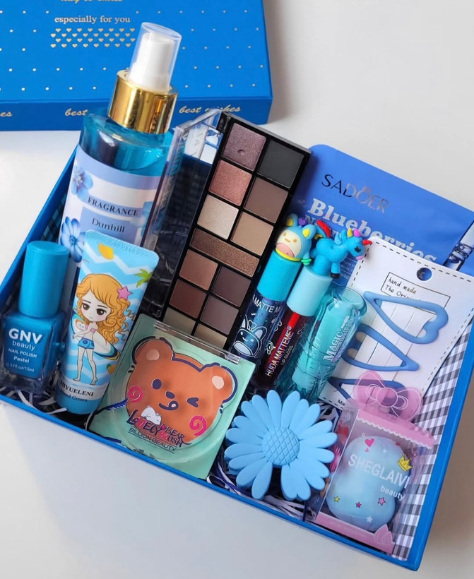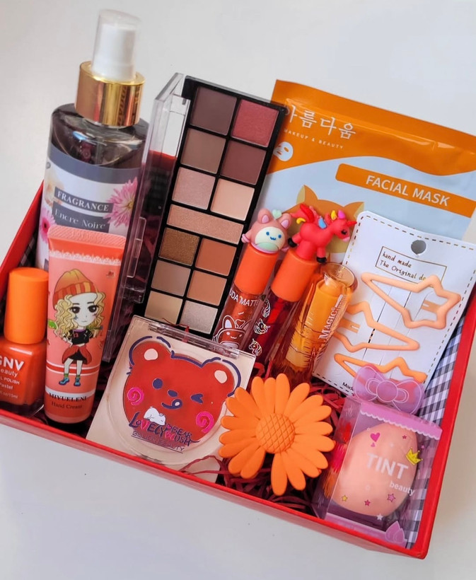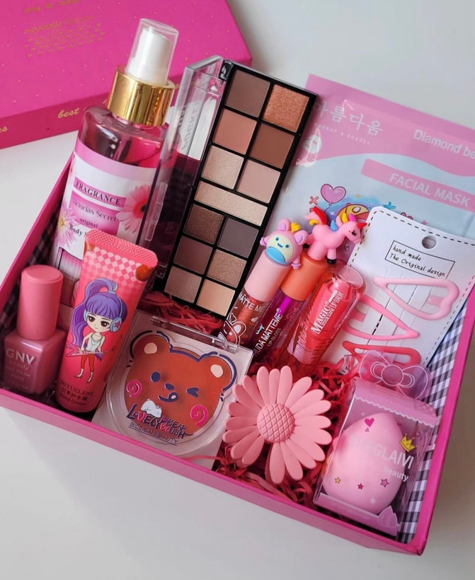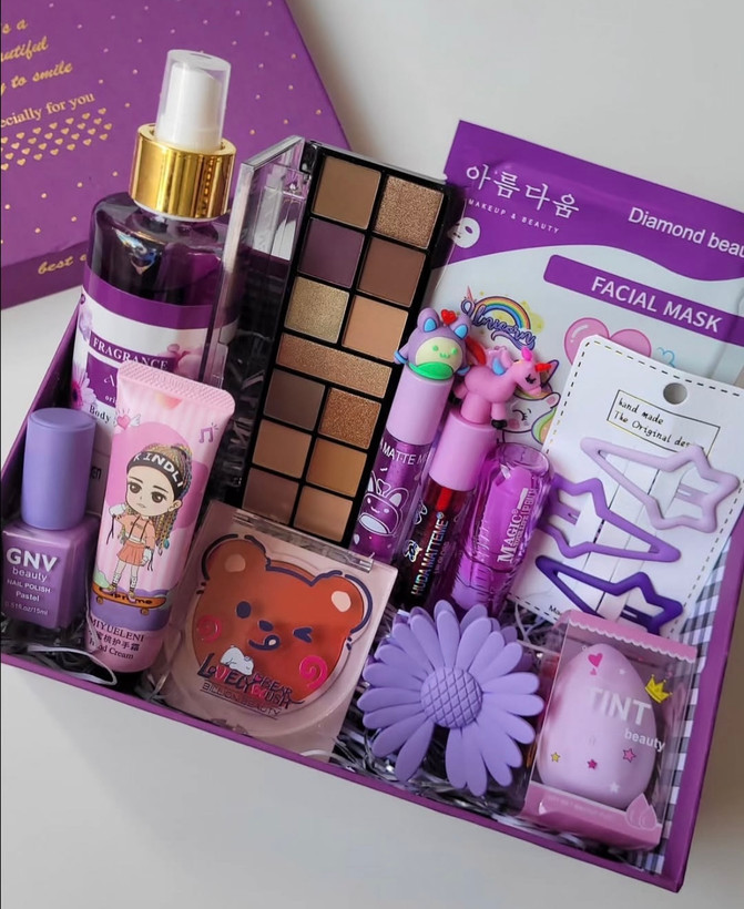 محصولات پک شاملبادی اسپلش،سایه،برق لب،،بالم لب،لاک،گیره،ماسک ورقه ای،رژگونه،مرطوب کننده،تینت لب،کش مو،بیوتی بلندر،باکس و پوشال